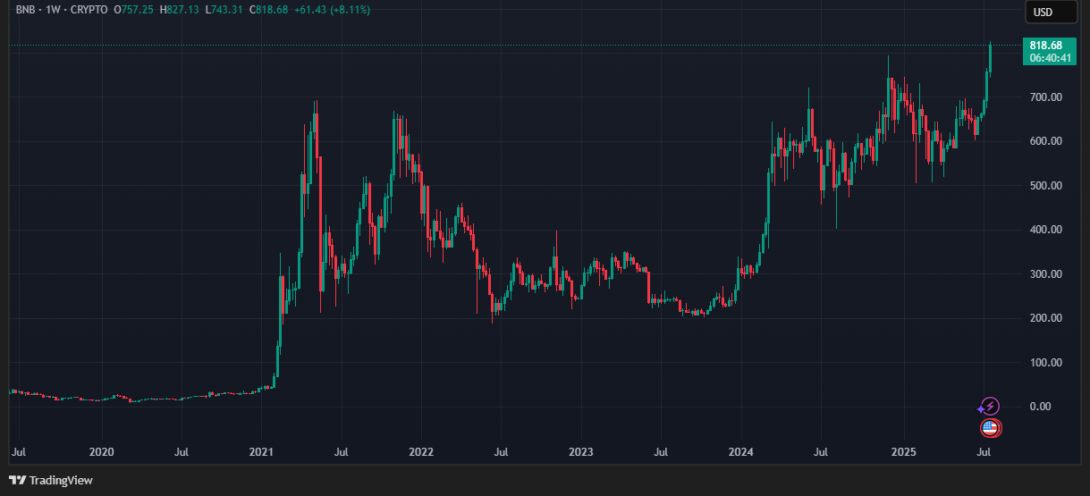 BNB, el token nativo de la red BNB Chain, marcó un nuevo máximo histórico (ATH) en dólares estadounidenses hoy, 27 de julio, al alcanzar una cotización de 827 dólares por moneda, tras subir un 10% en las últimas 24 horas.