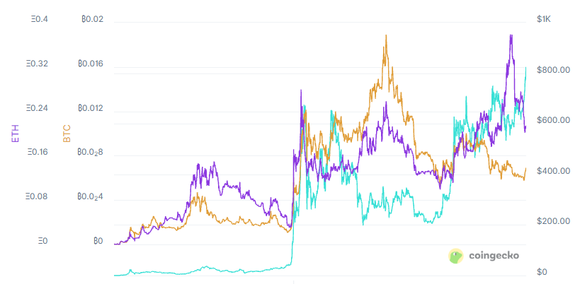 Al tiempo de esta redacción, el precio de la criptomoneda creada por el exchange Binance ha retrocedido ligeramente a 816 dólares, como se puede ver en el siguiente gráfico: