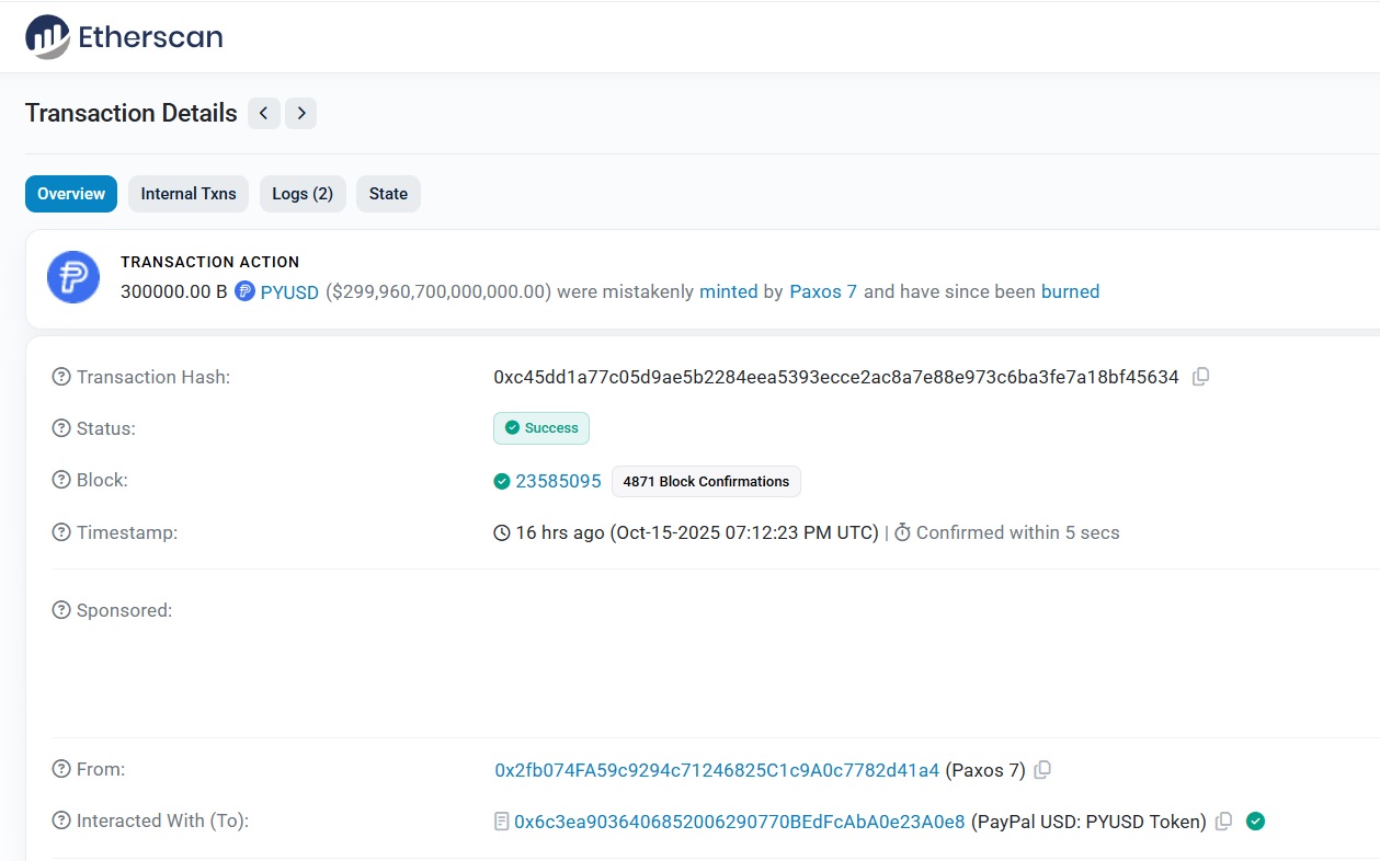 A las 3:12 p. m. (hora del Este de EE. UU.), Paxos, emisora de la stablecoin PayPal USD (PYUSD), acuñó por error 300 billones de tokens en la red Ethereum, equivalentes a unos 299,96 billones de dólares.
