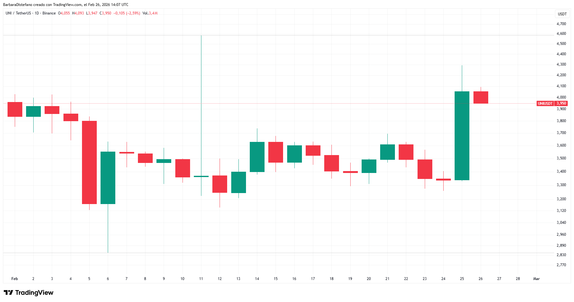 Con la recuperación de los niveles alrededor de los 4 dólares, volvió a una zona de precio que no tocaba en dos semanas. El siguiente gráfico muestra cómo se ha comportado UNI desde inicios de febrero: