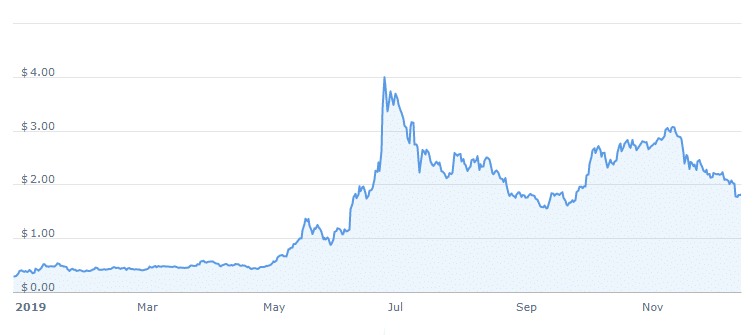A mediados del mes de diciembre, tezos alcanzรณ un precio de USD 1,74. Este ha sido el mรกximo precio durante el aรฑo, mientras que en su punto mรกs bajo, en febrero, cayรณ hasta los USD 0,35.