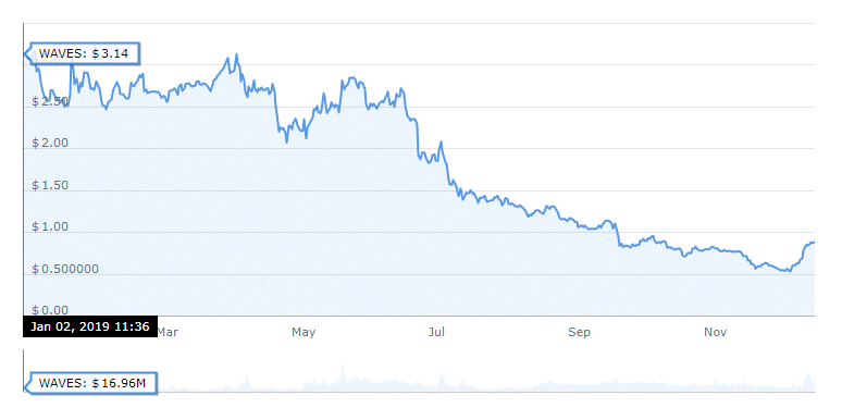 Entre las criptomonedas perdedoras de este 2019, destaca WAVES. Con un 71,25% de caรญda, esta ha sido la mรกs perdedora entre las principales 50 criptomonedas del mercado. A comienzos del aรฑo, WAVES tenรญa un valor de USD 3,14. Al momento de redactar esta nota, el precio de este activo es de apenas USD 0,89.