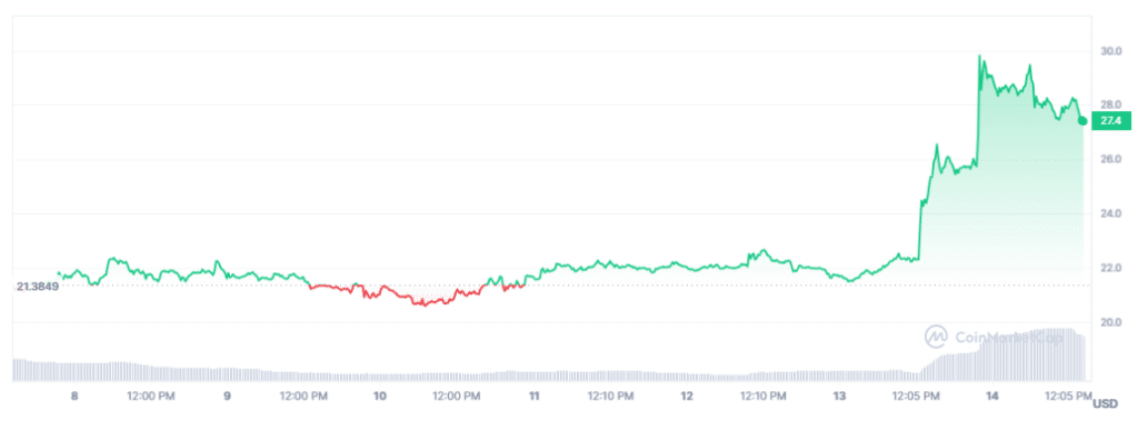 El cuarto puesto lo ocupa solana (SOL). Se trata de otra de las criptomonedas a las que la SEC, a inicios de junio, calificó como título valor no registrado, en las demandas que hizo contra Binance y Coinbase. Su apreciación semanal es de 41% y su precio actual está en USD 28,06. El triunfo de Ripple frente a la SEC le da alivio a SOL tras un trimestre de malas noticias. Tal como se observa en un informe de la firma Messari, entre abril y junio, solana perdió casi 10% de su capitalización de mercado y se vio reducido el número de validadores.