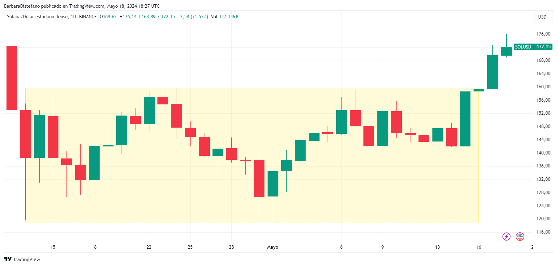 Precisamente, esta semana, el precio de SOL superó la fase de lateralización que mantuvo durante un mes entre los USD 120 y USD 160. Puede apreciarse este movimiento alcista en el siguiente gráfico.