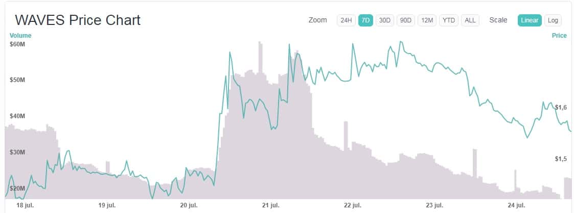 Waves se encuentra en el top de las criptomonedas mรกs apreciadas por segunda semana consecutiva. El crecimiento promedio del precio de la criptomoneda alcanza el 7,5%. Todo esto, en medio de la difusiรณn de informaciones sobre la asociaciรณn con Band Protocol, un proyecto que se presenta como un โorรกculo de datos descentralizado de cadena cruzadaโ.