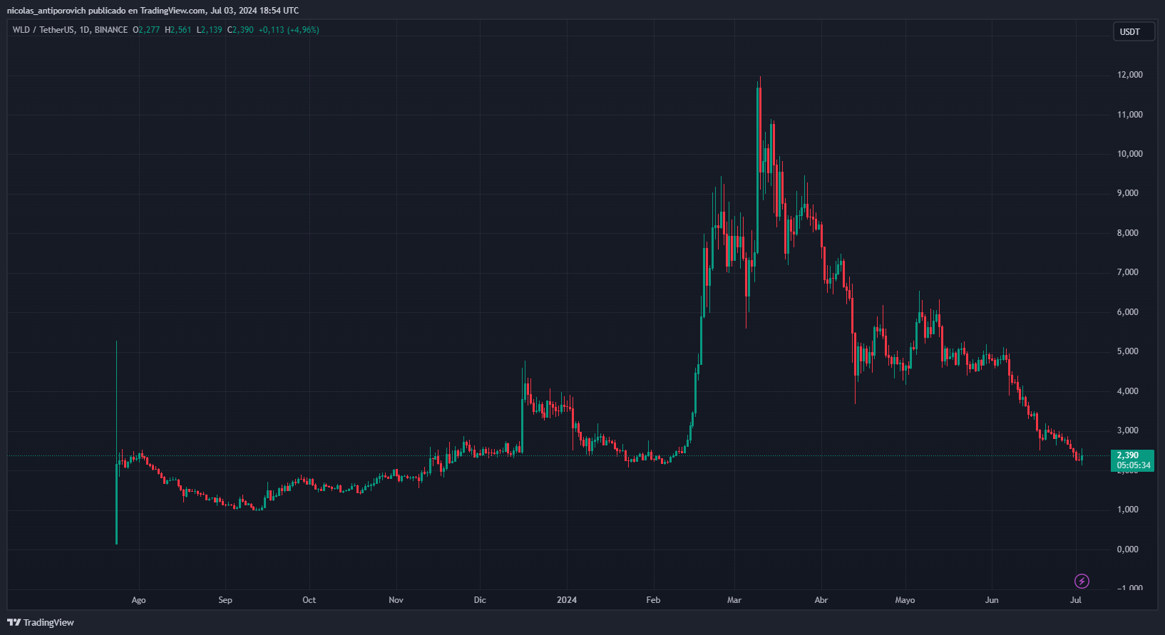 En el siguiente gráfico, provisto por TradingView, puede verse el comportamiento que ha tenido el precio de WLD desde su lanzamiento: