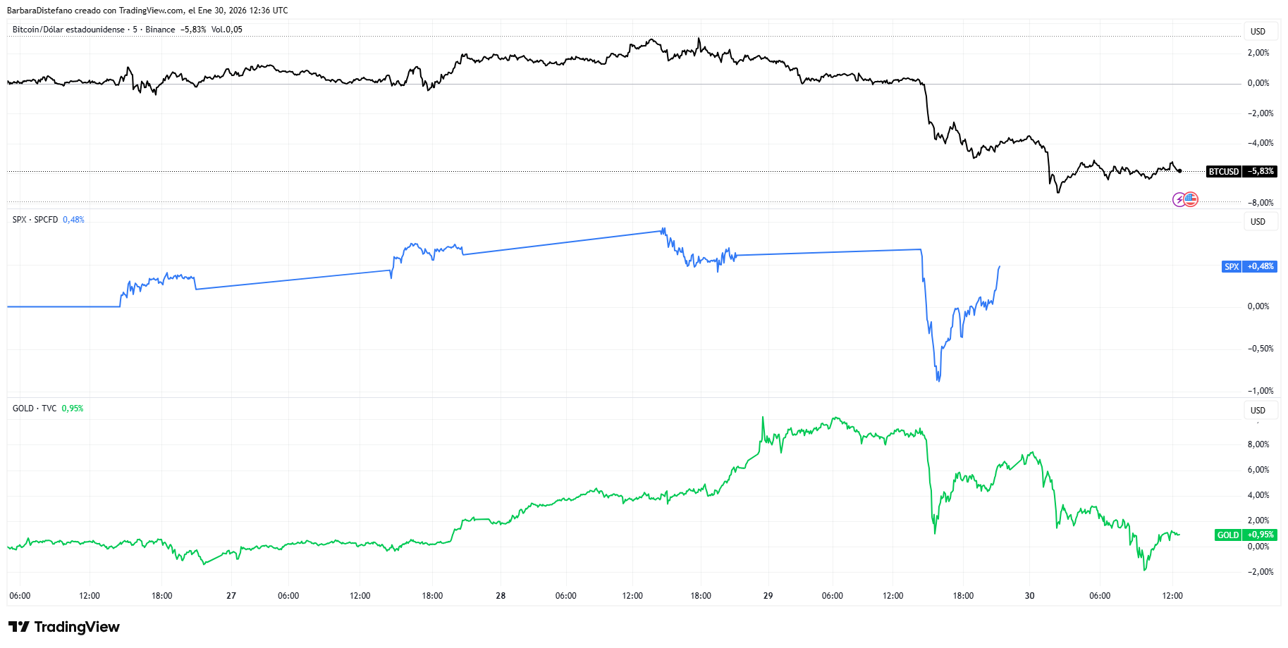 Este movimiento se produce en medio de alta volatilidad en los mercados globales, no solo el bursátil. Tanto el S&P 500 (SPX) —que recopila 500 acciones de grandes empresas cotizadas en Estados Unidos— como diversos activos, incluidos el oro y bitcoin (BTC), registraron caídas pronunciadas en las últimas 24 horas. En el caso del índice bursátil y el metal, el retroceso ocurre después de que tocaran nuevos precios máximos históricos.