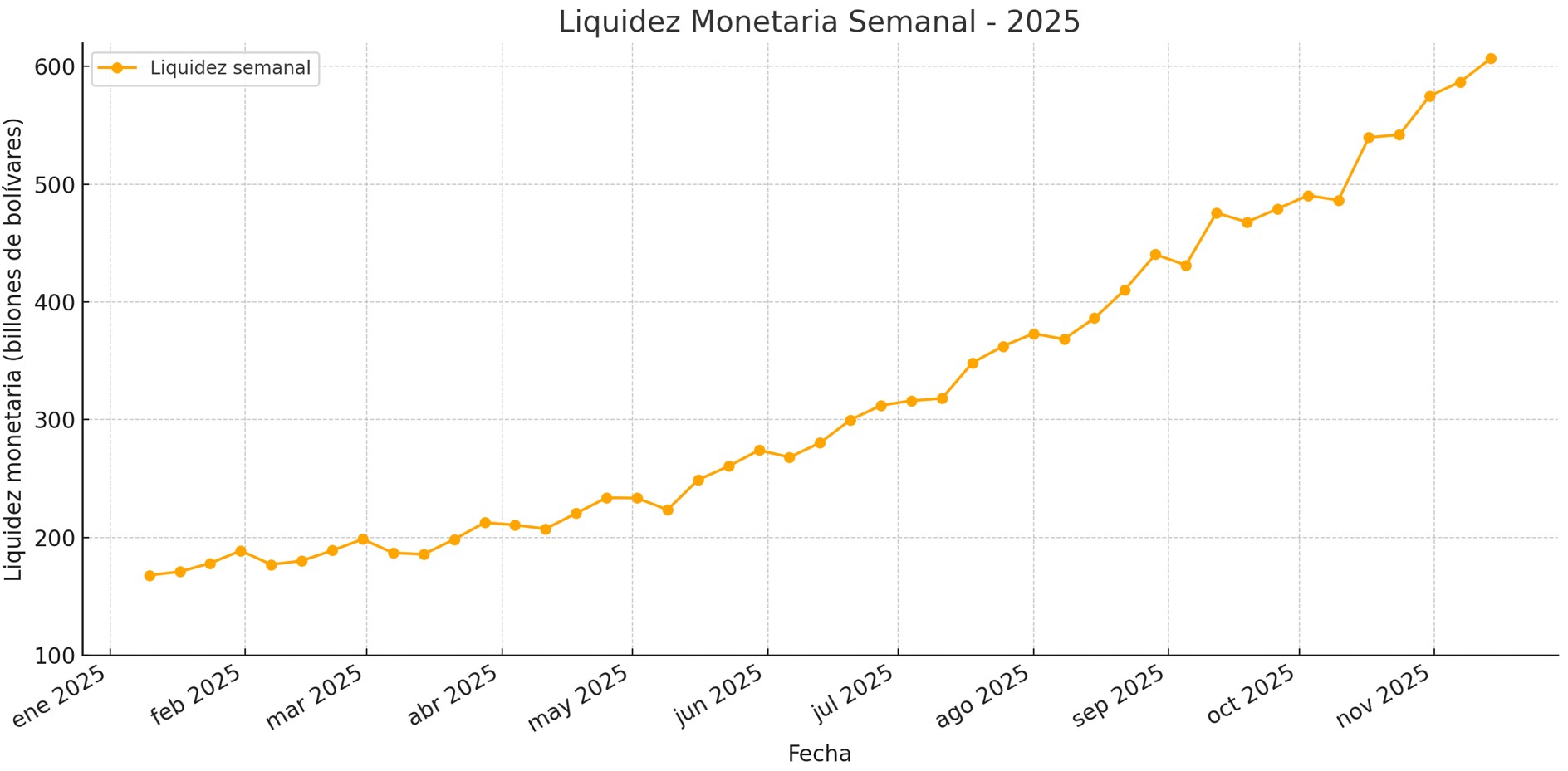 La liquidez monetaria de Venezuela, medida semanalmente por el Banco Central (BCV), se ha expandido con fuerza durante 2025.