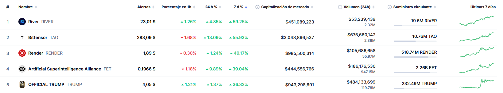 Al mismo tiempo, el rally de TAO —criptomoneda apodada por muchos inversores como «el bitcoin de la inteligencia artificial» (aunque nada tiene que ver con bitcoin)— se montó sobre una ola sectorial más amplia. Varios tokens vinculados con la inteligencia artificial lideraron las ganancias semanales de las criptomonedas. En ese contexto se destacaron render (RENDER) y Artificial Superintelligence Alliance (FET).