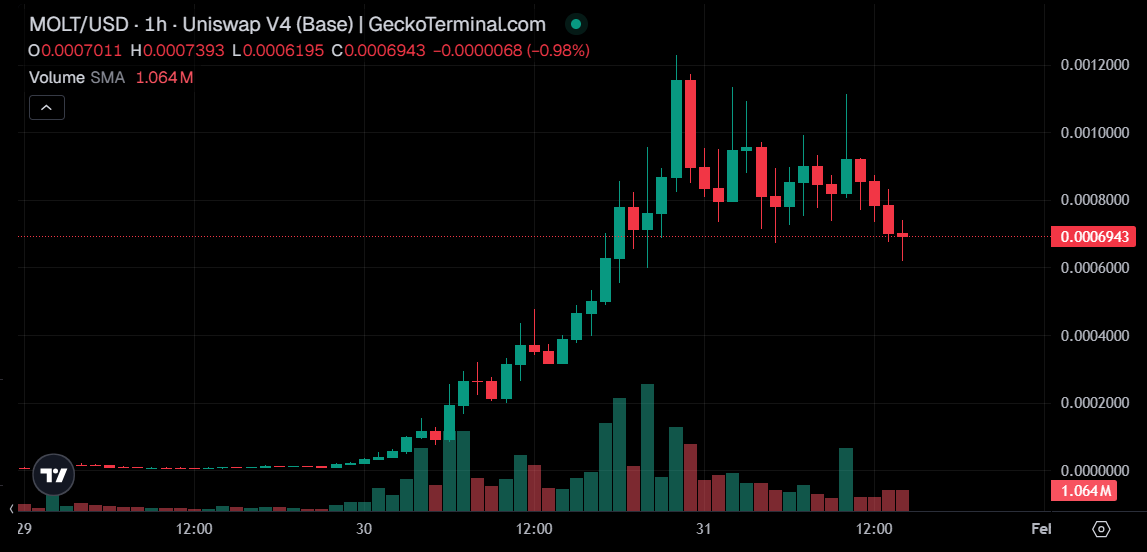 Particularmente, MOLT, lanzado hace cuatro dรญas en la red Base por un precio de USD 0,0000054 en su primera hora, ha llamado la atenciรณn al llegar ayer a USD 0,0012205 registrando una subida de mรกs de 25.000%. Y, aunque hoy retrocediรณ, mantiene una apreciaciรณn de mรกs de 10.000%. Cotiza al momento de esta redacciรณn a USD 0,0006788.