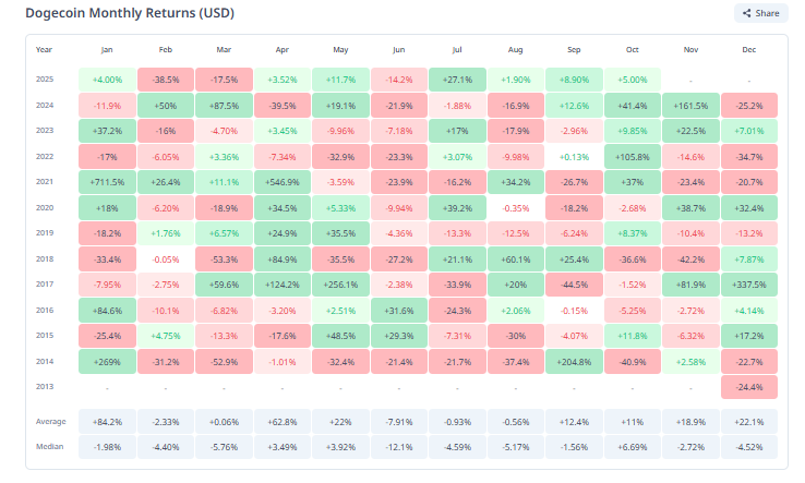 De todas formas, octubre tiene un historial mixto para el precio de dogecoin, aunque con predominancia de rendimientos positivos, sobre todo en los últimos años, tal como se observa en el siguiente gráfico: