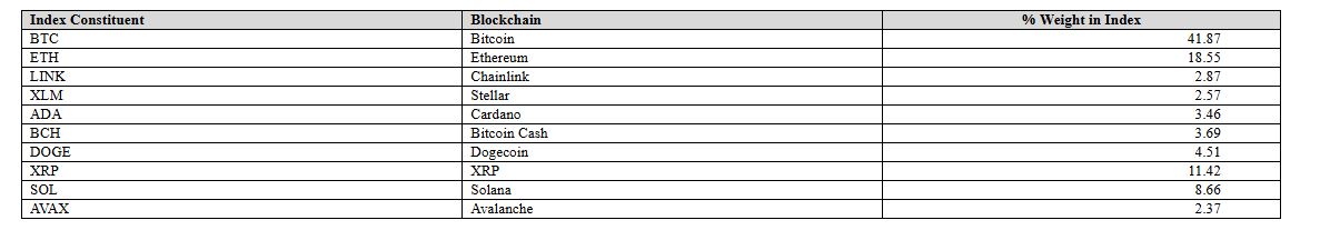De acuerdo con la composición del índice de referencia, que funciona como base para la asignación del fondo, DOGE tendría un peso cercano al 4,5%. SHIB, aunque figura entre los activos elegibles, no aparece entre los componentes con ponderación detallada en la tabla presentada. Los mayores pesos corresponderían a BTC, con 41,87%, y ETH, con 18,55%.