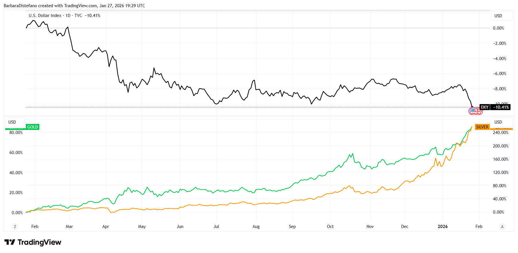 También en último año, los metales preciosos mostraron una tendencia opuesta. El oro, medido en dólares, se apreció alrededor de 83% y la plata un 248%. Tales activos registraron precios máximos históricos el lunes en los 5.100 y 117 dólares (USD), respectivamente.
