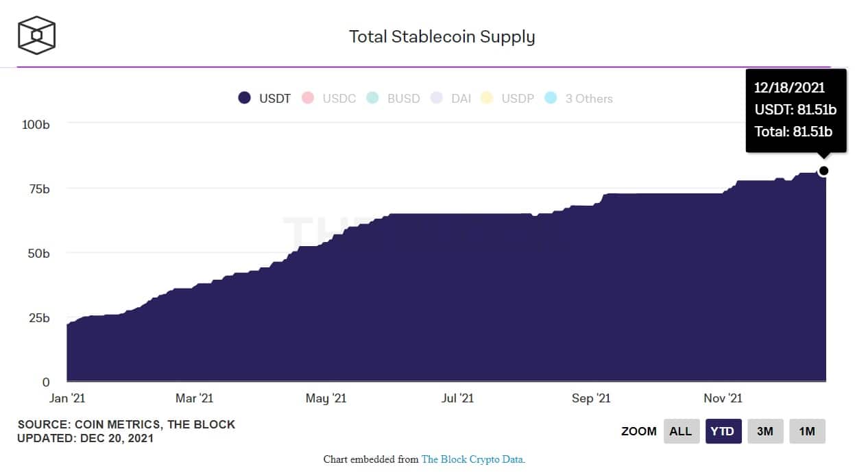 Como indican los gráficos que se muestran a continuación, tether comenzó el año con algo más de USD 21.000 millones de unidades de su criptomoneda respaldadas en dólares y lo finalizó superando los USD 81.000 millones. Es decir, casi que cuadruplicó su volumen.