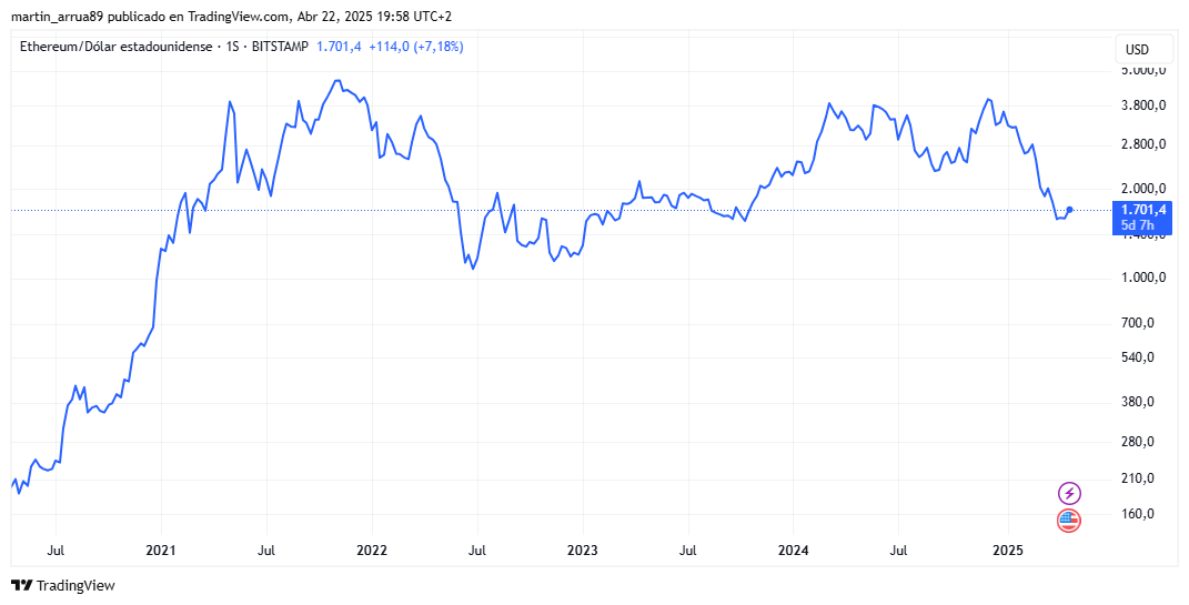 Actualmente, el precio de ETH es de 1.700 dólares, 65% por debajo de su máximo histórico (ATH).