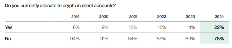 El incremento del 11% en 2023 al 22% en 2024 representa una duplicaciรณn en la asignaciรณn de criptomonedas en portafolios de clientes.