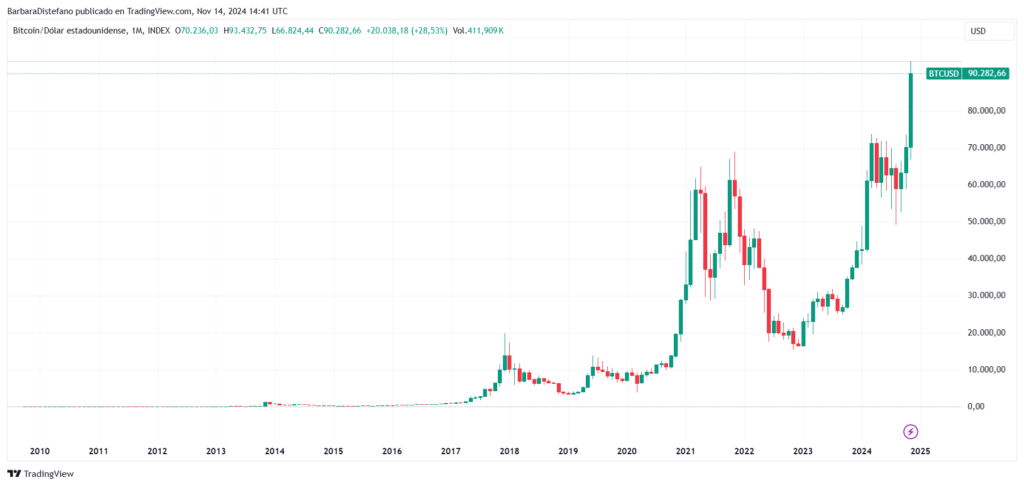 Puede observarse en el siguiente gráfico el precio de bitcoin a lo largo de la historia.