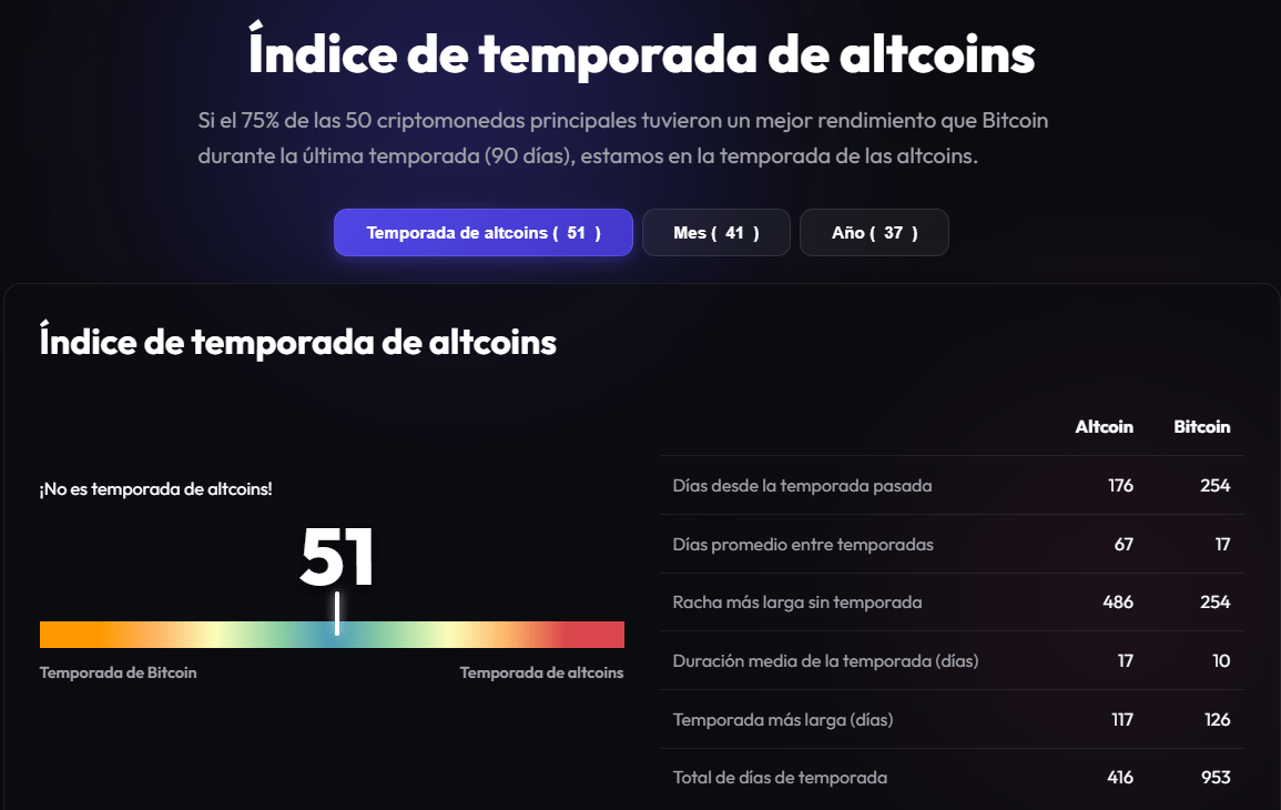 Este escenario se ve alimentado por factores macroeconรณmicos que bloquean el inicio de una nueva altseason. La persistencia de tasas de interรฉs elevadas y las tensiones energรฉticas en Oriente Medio han erosionado el apetito por las altcoins, mientras que el รndice Altcoin Season se sitรบa en apenas 51 puntos, lejos del umbral de 75 necesario para un cambio de tendencia.