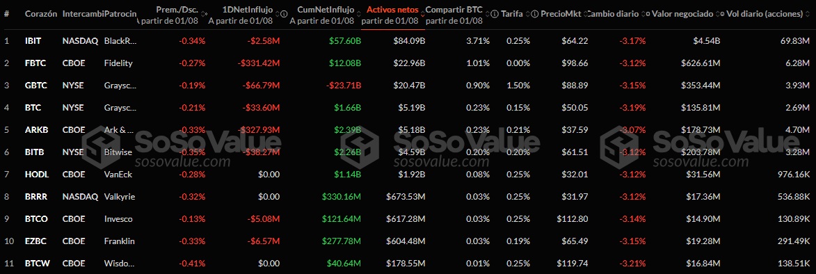 El ETF FBTC de Fidelity liderรณ las salidas con 331,42 millones de dรณlares en reembolsos, seguido de cerca por el ARKB de ARK Invest, con una caรญda de 327,93 millones de dรณlares. El GBTC de Grayscale perdiรณ 66,79 millones de dรณlares, mientras que el IBIT de BlackRock mostrรณ una salida mรกs moderada de 2,58 millones de dรณlares.