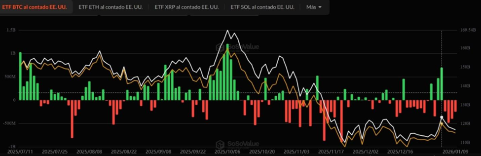 Los datos muestran que los ETF de Bitcoin comenzaron el mes con flujos positivos. El 2 y el 5 de enero registraron entradas por USD 471,1 millones y USD 697,2 millones, respectivamente. Sin embargo, ese impulso no se sostuvo y dio paso a cuatro jornadas consecutivas de salidas netas, lo que llevó a cerrar la semana con un balance negativo acumulado.