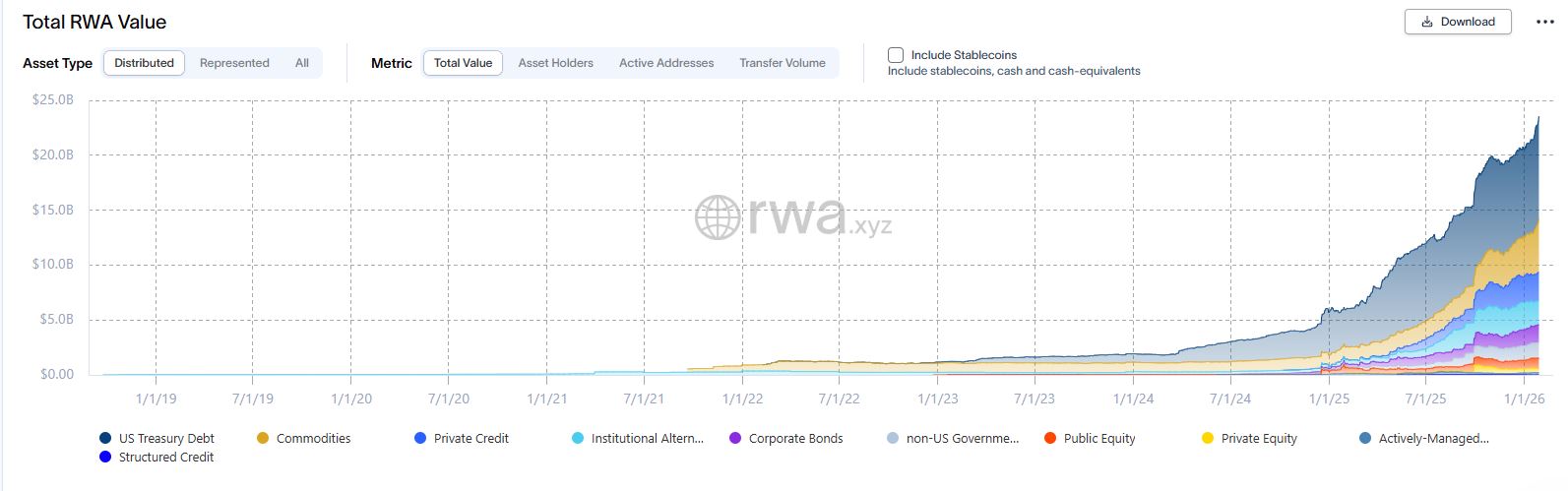 El ecosistema creado por Vitalik Buterin es el mรกs utilizado de la industria de los RWA. En la actualidad, el valor de los activos tokenizados desplegados sobre Ethereum supera los 24.020 millones de dรณlares, como se refleja en el siguiente grรกfico.