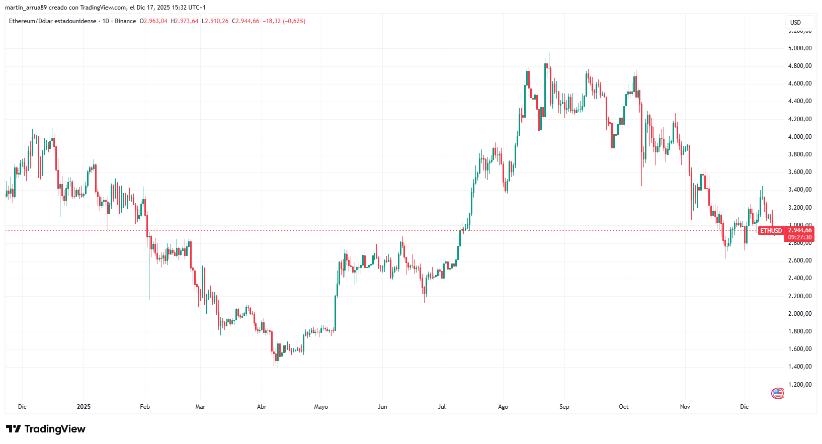 Al momento de la publicación de esta nota, ETH se negocia alrededor de los 3.000 dólares, tal como se observa en el siguiente gráfico: