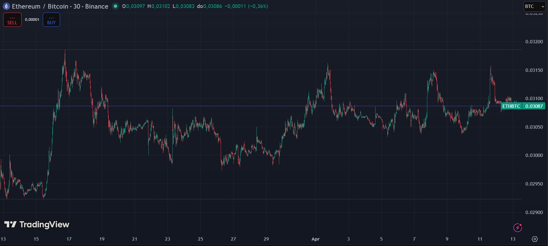 En ese período, la cotización de ETH subió desde los 0,0295 BTC hasta los 0,03087 BTC actuales, como se aprecia en el gráfico.