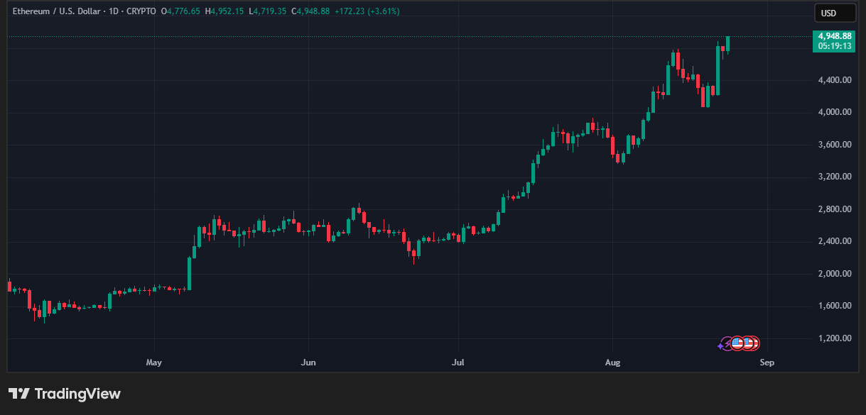 El precio de ether (ETH), la moneda nativa del protocolo Ethereum, alcanzó los 4.948 dólares el 24 de agosto, marcando un nuevo máximo histórico (ATH, por sus siglas en inglés). Es la primera vez en que el activo supera la barrera de los 4.900 dólares.