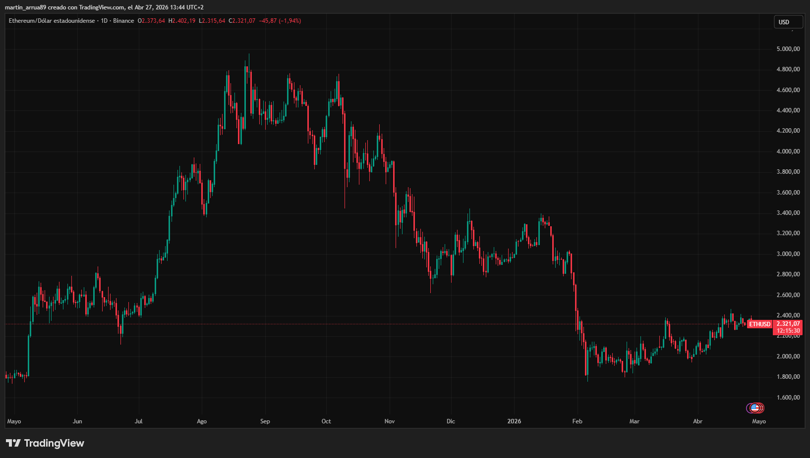 Actualmente, ETH se negocia en torno a los 2.320 dólares, un 53% por debajo de su máximo histórico de 4.953 dólares, alcanzado en agosto de 2025, tal como lo informó CriptoNoticias.