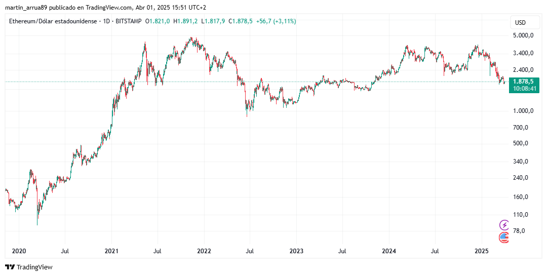 Ether (ETH), la criptomoneda nativa de la red Ethereum, cerrรณ el primer trimestre del 2025 con una caรญda de precio en dรณlares del 45%.