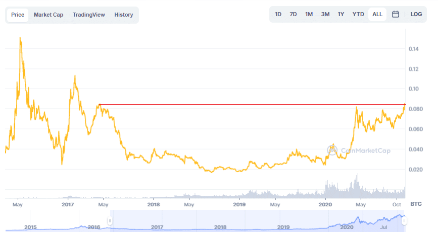 A pesar del momento actual, ETH se mantiene muy por debajo de otro pico anterior en BTC: más de 0,1 BTC por cada ETH a comienzos de ese mismo año. El máximo histórico para la criptomoneda nativa de la red donde corren cientos de tokens está incluso más lejos. En junio de 2017, su valor rozó los 0,15 bitcoins, casi al doble del valor que tiene ahora mismo con respecto a la primera criptomoneda del mundo.