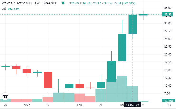 En los รบltimos 7 dรญas, Waves se apreciรณ 22,31% para pasar a USD 32,56 por moneda. En lo que va de aรฑo, su subida ronda el 117%, algo especialmente notable si tomamos en cuenta que la mayorรญa del mercado, con bitcoin incluido, estรก en rojo en comparaciรณn con el comienzo de este 2022.