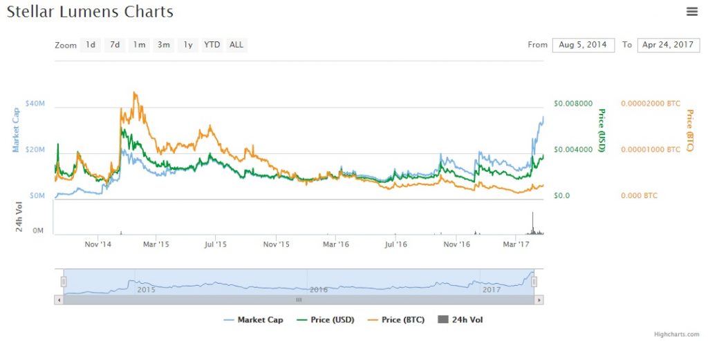 Por otro lado, entre los movimientos más relevantes del mercado al inicio de esta semana también destaca Stellar Lumens con un alza de 10,91% que le ha llevado hasta un valor de 0,003893 dólares o 0,00000317 BTC. Stellar ha venido acumulando valor en las últimas semanas hasta alcanzar una máxima capitalización de mercado por encima de los 36,27 millones de dólares. El pasado 29 de marzo, además, se anunció la futura distribución de 16 mil millones de Lumens a poseedores de bitcoins como muestra de confianza en el sistema, abarcando el 19% de la disponibilidad inicial, lo que se concretaría a partir del próximo mes de junio.