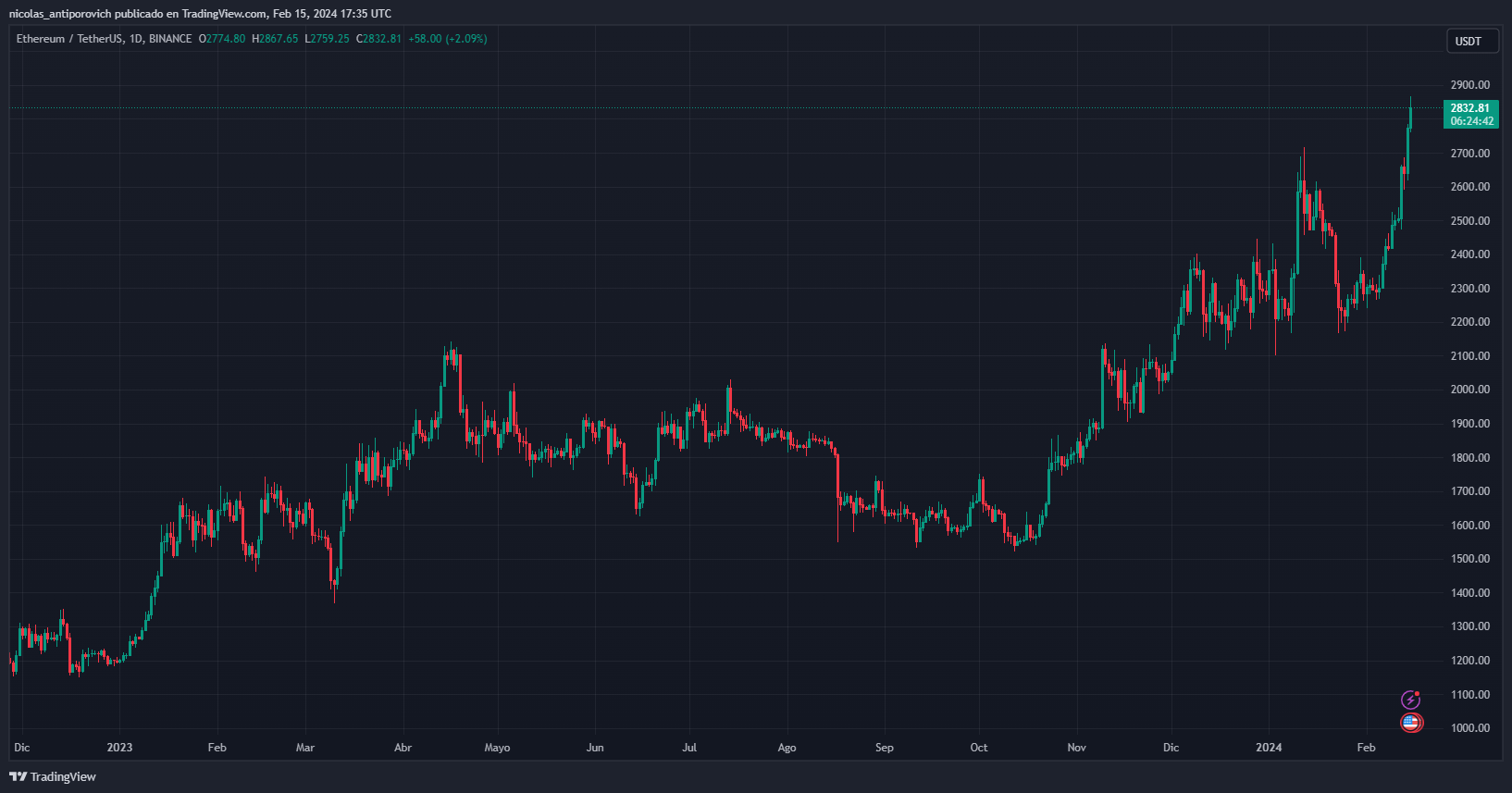 En el siguiente gráfico, provisto por la plataforma TradingView, puede observarse cómo ha sido el movimiento de precio de ETH desde finales de 2022: