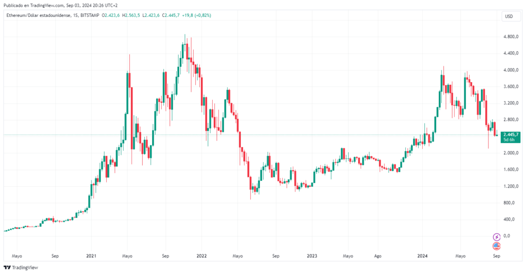 En el siguiente gráfico se puede observar que ETH descendió de la zona de los 3.500 dólares hasta los 2.400 dólares, un 50% por debajo de los 4.890 dólares, el máximo histórico (ATH) que alcanzó el 1 de noviembre de 2021.