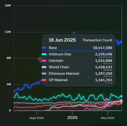 Asimismo, el 16 de junio, Base lideró con más 10 millones de transacciones durante esa jornada, seguida por Arbitrum con 2 millones, Unichain con 1.5 millones, World Chain con casi 1.5 millones y OP Mainnet superando el millón de operaciones ese día.