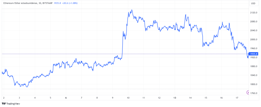 Un ejemplo de esa tendencia alcista de ETH, se puede ver en lo que va del mes de noviembre (medido en dólares). La criptomoneda llegó a superar la barrera de los 2.000 dólares, algo que no sucedía desde el pasado julio. Actualmente el precio de la moneda se ubica en 1.914 dólares, como muestra el gráfico de TradingView.