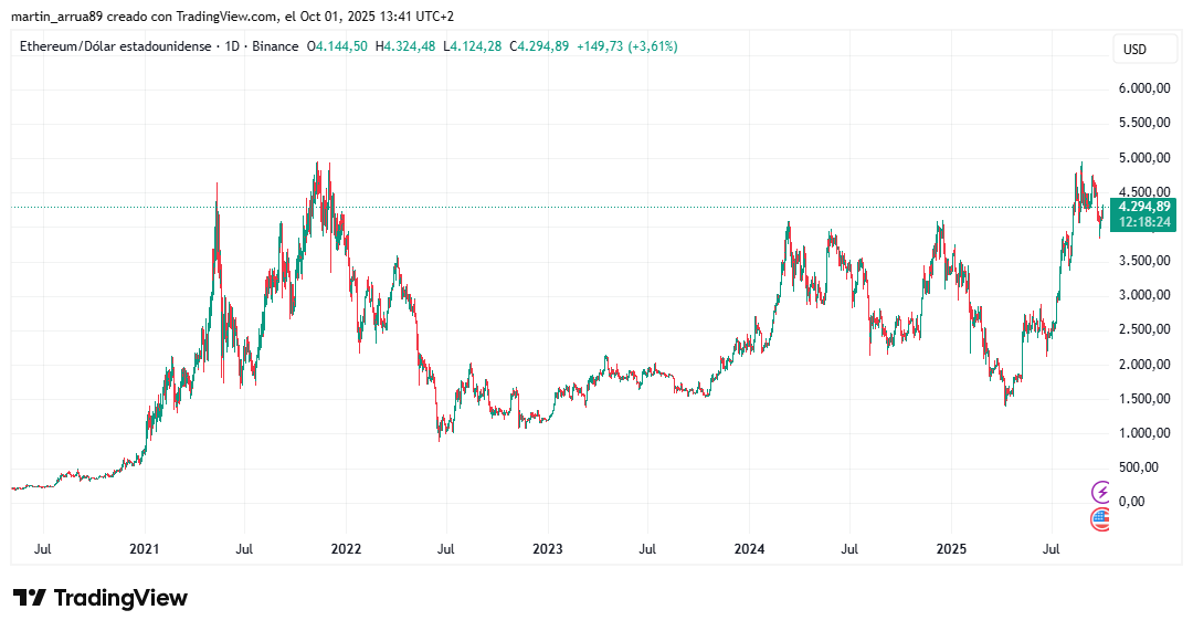 Ese rendimiento extraordinario tuvo su momento más destacado a finales de agosto, cuando la moneda nativa de Ethereum alcanzó un nuevo máximo histórico (ATH) de 4.950 dólares, superando el récord de 2021.