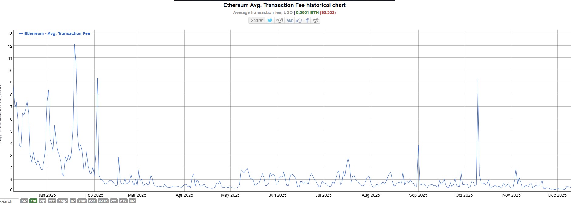 De enero a diciembre de 2025, el promedio de tarifas de transacción de Ethereum ha caído un 96%. Fuente: BitInfoCharts.