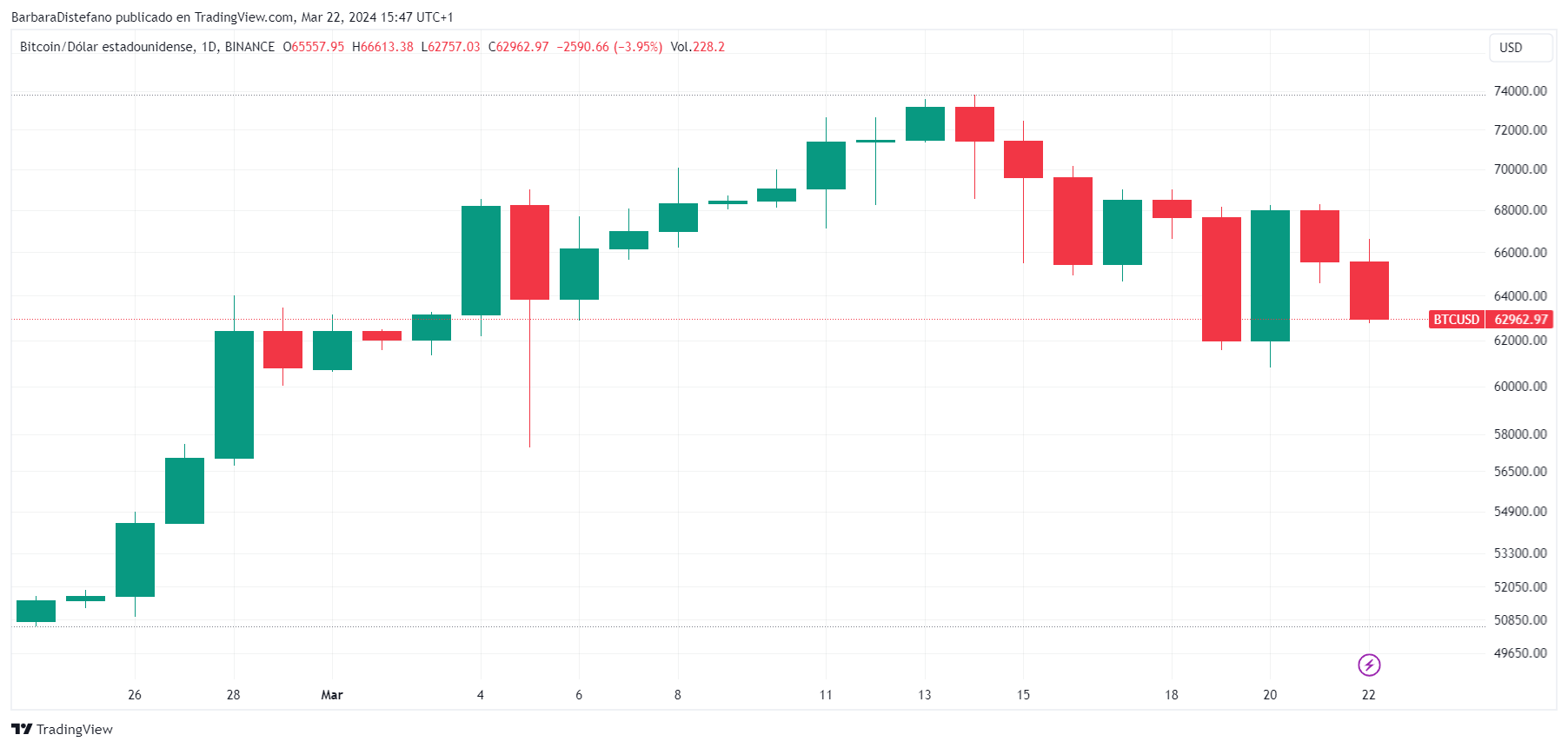 De hecho, menciona que, ante el retroceso que provocaron las ventas, las direcciones con grandes cantidades de bitcoin ya iniciaron una reacumulación en precios arriba de los 60.000 dólares (USD). Eso propició que no decaiga de esa zona tras caer del máximo histórico (ATH) de 73.700 dólares tocado la semana pasada, como se ve a continuación.