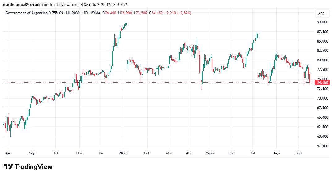 Al momento de la publicaciรณn de este artรญculo, el bono AL30 se negocia en 74.150 pesos argentinos, tal como se observa en la siguiente imagen provista por TradingView: