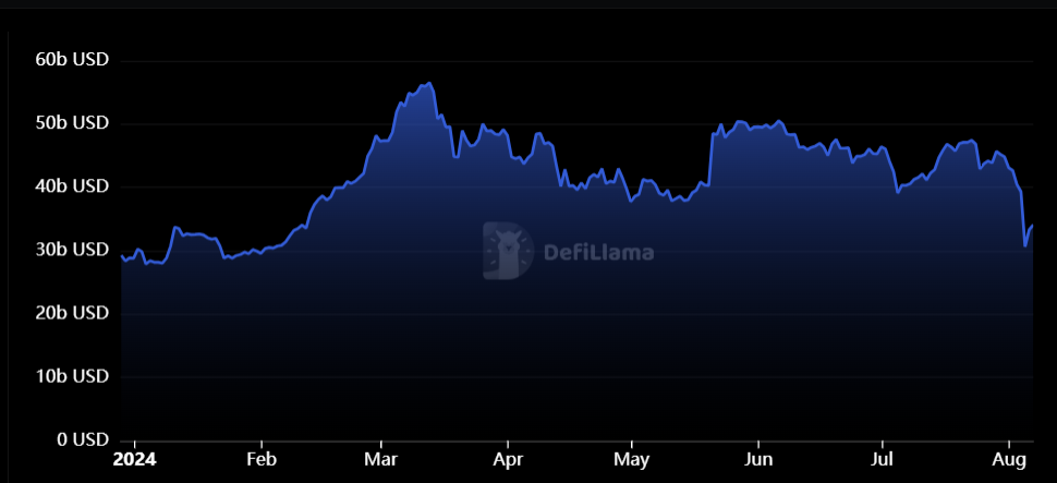 No obstante, desde marzo hasta la actualidad ha tenido altibajos. La caída más fuerte del TVL se dio desde finales de julio hasta principios de este mes, debido a una caída general de los mercados incentivada por decisiones económicas tomadas en Japón, el incremento del desempleo en Estados Unidos y tensiones geopolíticas en Medio Oriente.