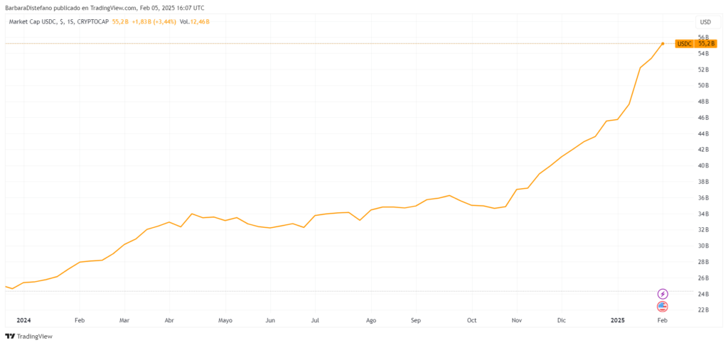 Esto es a pesar de que la capitalización de USD Coin (USDC), la stablecoin que le sigue en capitalización, se ha visto beneficiada de cumplir con la ley MiCA. Con su establecimiento, siguió en ascenso a un máximo histórico actual de USD 55.200 millones.