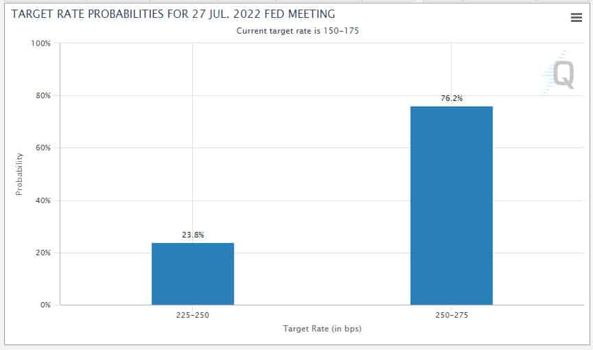 El próximo aumento de las tasas se espera en la reunión del Comité Federal de Mercado Abierto (FOMC) del 26 y 27 de julio, donde hay probabilidades de que se supere el incremento récord realizado en junio pasado, de 0,75%, o 75 puntos base. Este aumento, comentado por CriptoNoticias, fue anunciado el 15 de junio pasado y llevó la tasa de interés al rango entre 1,5% y 1,75%.
