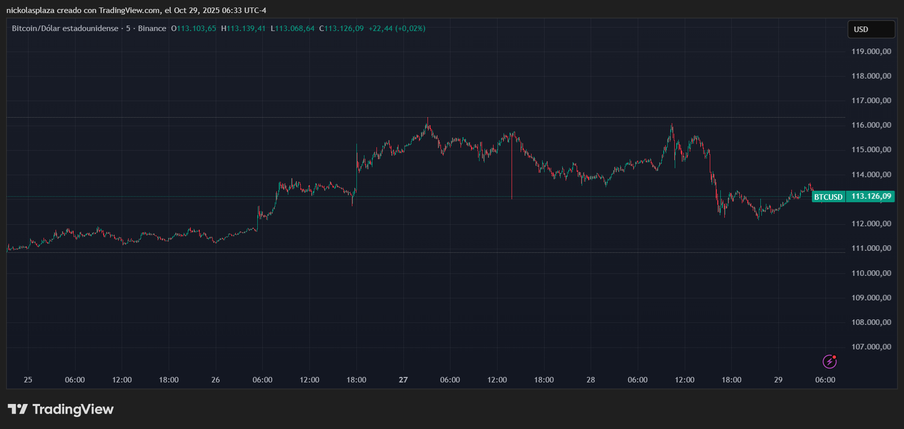 Por lo pronto bitcoin bajó su precio hasta los 112.000 dólares para recuperarse hasta los 113.126 dólares. La moneda digital viene de cotizar en 115.000 durante la jornada de ayer, como se aprecia en la siguiente imagen.