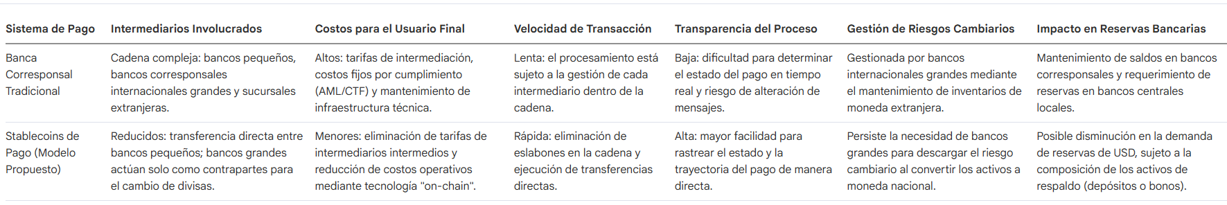 Con una stablecoin de pago, el banco pequeño estadounidense convierte 1 dólar en reservas por 1 dólar en stablecoin y lo transfiere directamente al banco pequeño mexicano, que acredita los pesos al destinatario y luego vende la stablecoin al banco mexicano grande para desprenderse del riesgo cambiario. El intermediario grande no desaparece, pero su rol se reduce: ya no es el canal obligatorio por el que fluye el pago, sino el proveedor de liquidez al final de la cadena.