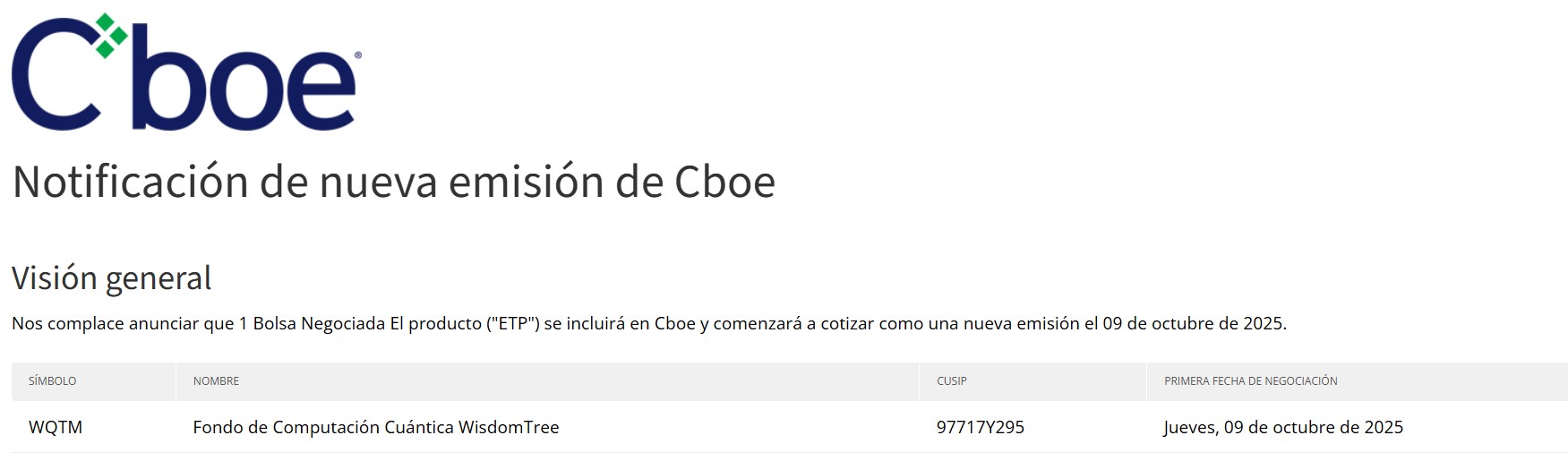 La firma de inversiones WisdomTree lanzó en la Bolsa de Opciones de Chicago (CBOE) el WisdomTree Quantum Computing Fund (WQTM), un fondo diseñado para ofrecer exposición a las acciones de empresas vinculadas al desarrollo de computación cuántica y criptografía postcuántica.