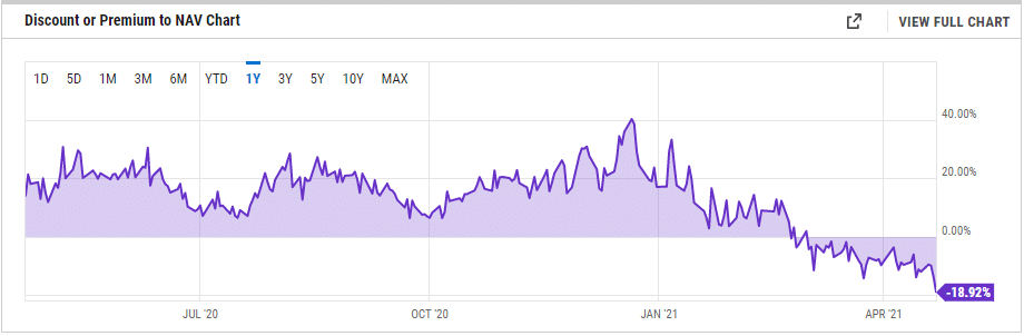 La situaciรณn particular con GBTC es que cotiza con un descuento del 19%, su punto mรกs bajo en la historia, segรบn YCharts. Esto significa que cada acciรณn de GBTC se compra y vende a un precio que estรก 19% por debajo de su costo de emisiรณn.