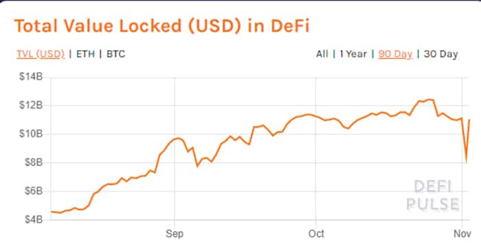 Este último volumen no se visualizaba desde agosto del 2020, cuando la popularidad de DeFi empezaba a repuntar y el mercado estaba en pleno crecimiento. En consonancia con esta disminución, la cantidad de dinero depositado en contratos inteligentes de aplicaciones DeFi también ha decaído. El mercado tenía unos 12 mil 400 millones de dólares retenidos en sus contratos para el 25 de octubre, según DeFi Pulse. Pero en cuestión de horas esta reserva se precipitó a los 8 mil millones de dólares, para días después recuperarse en los 11 mil millones de dólares.