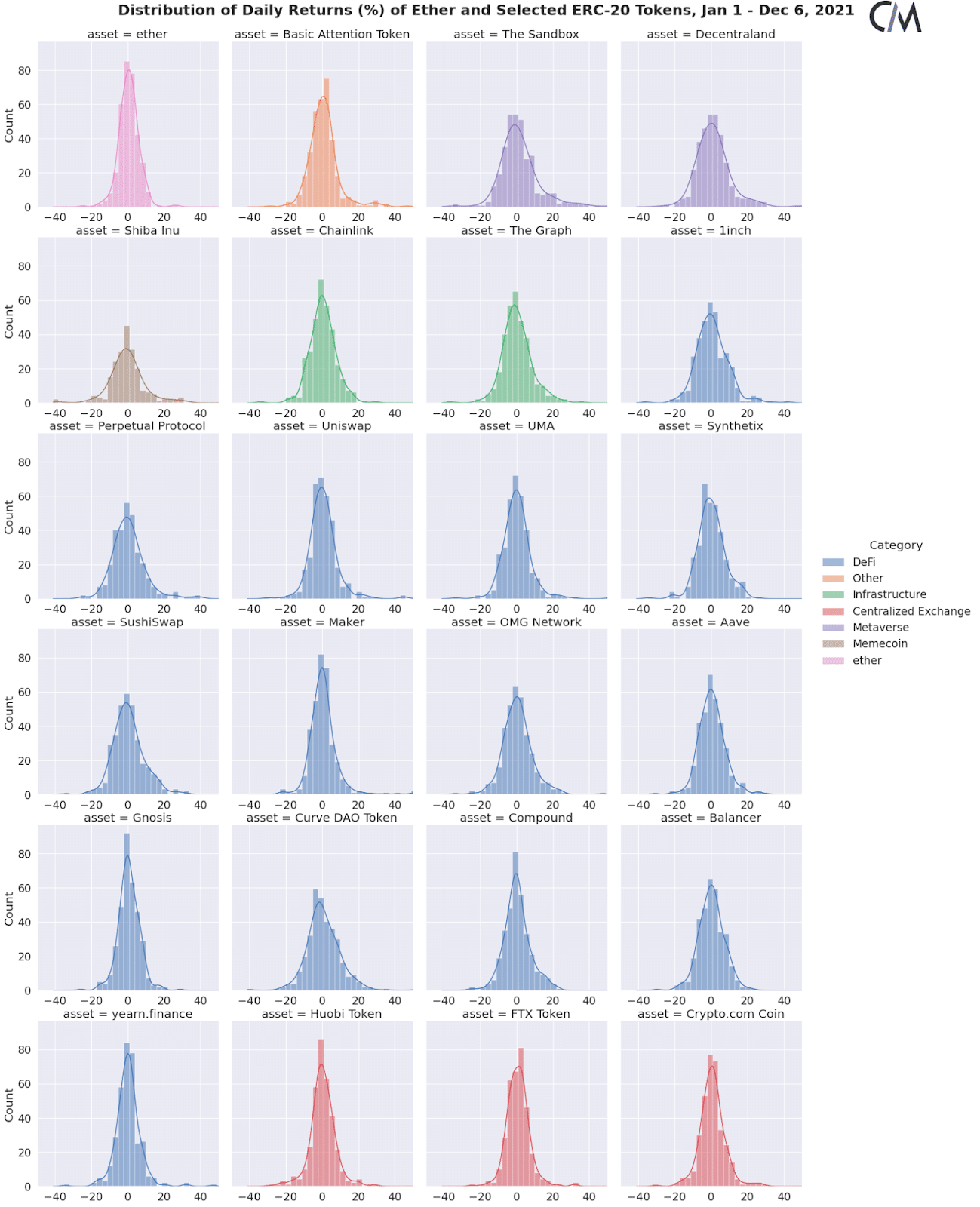 El reporte de Coin Metrics muestra los rendimientos diarios, entre el 1 de enero y el 6 de diciembre de 2021, para ETH y los compara con los principales tokens ERC-20 del mercado. Entre ellos, señala a los tokens de los metaversos como The Sandbox (SAND) y Decentraland (MANA) y la criptomoneda meme Shiba Inu (SHIB).